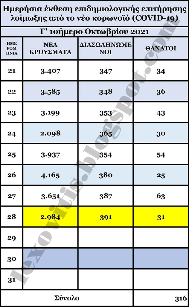 Ημερήσια έκθεση επιδημιολογικής επιτήρησης λοίμωξης από το νέο κορωνοϊό (COVID-19) Δεδομένα έως 28 Οκτωβρίου 2021, ώρα 15:00